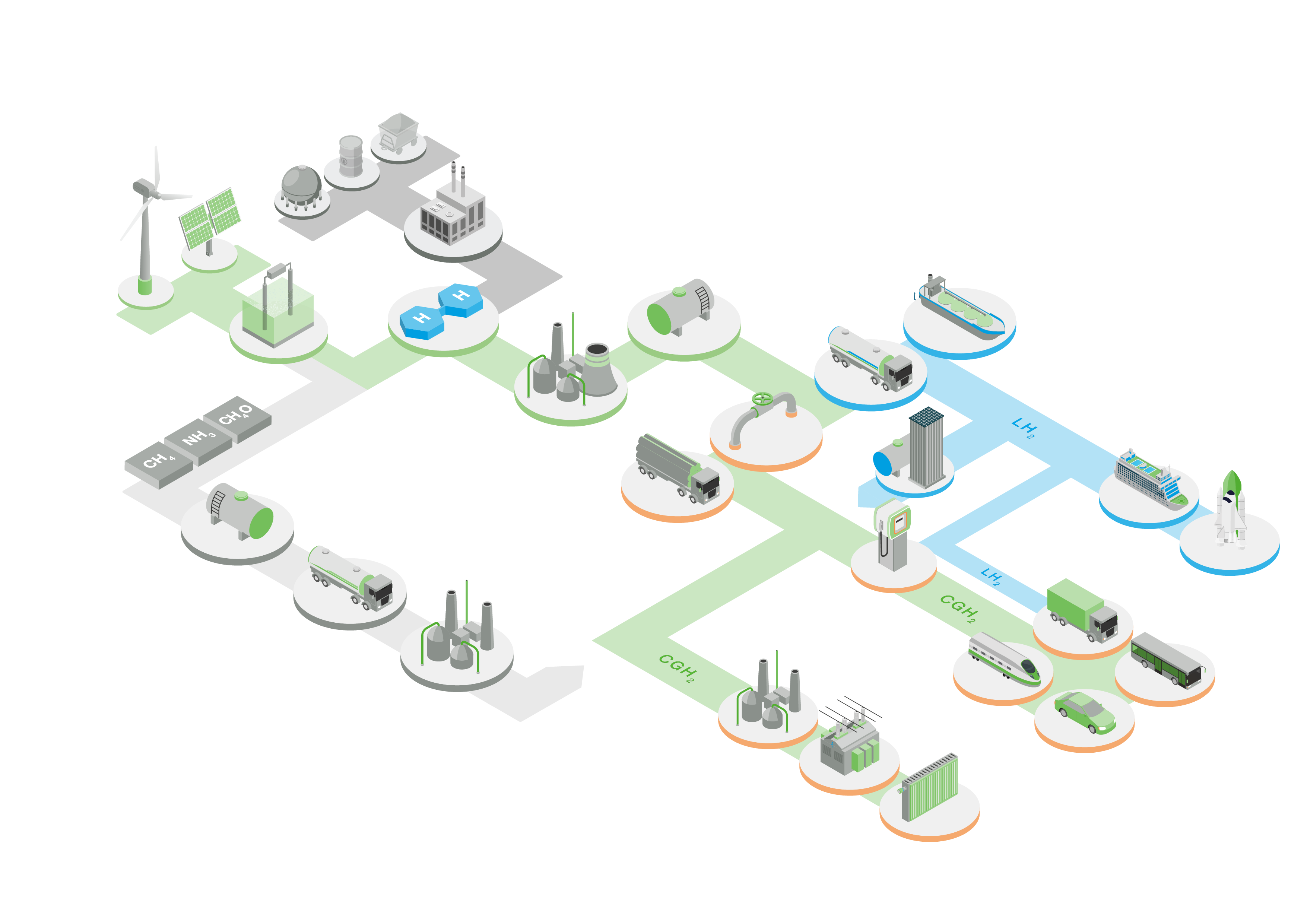 - Finalmente, en el punto de uso, el hidrógeno (o el portador de hidrógeno) puede ser utilizado directamente o convertido nuevamente en electricidad.